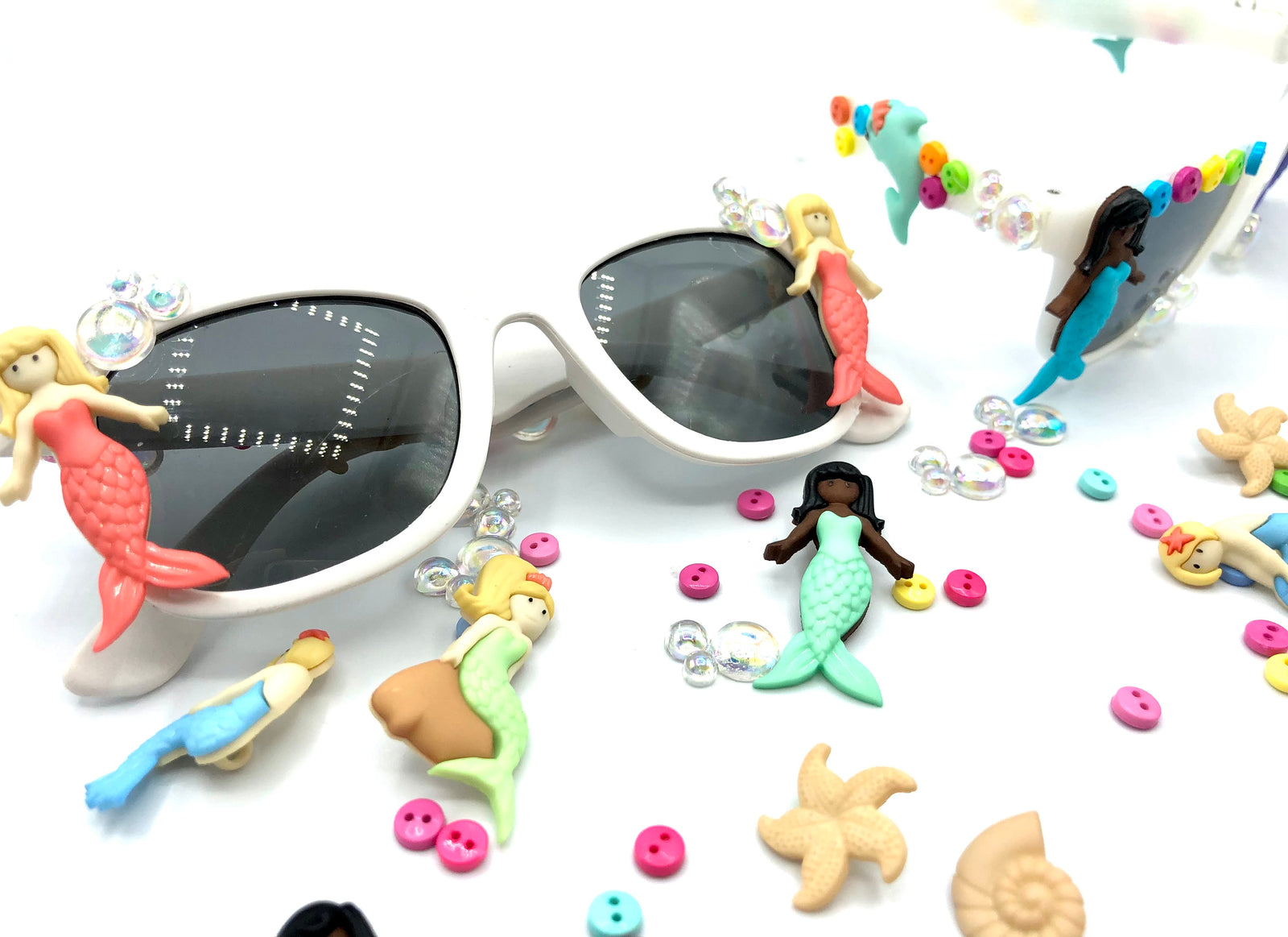 Looking for a fun craft to do with your little mermaid, or perhaps as a gift to enjoy all summer long? Tricia Giazzon of Pink Poodle Jewelry is here today to share a tutorial for making a mommy & me set of sunglasses featuring Dress it Up Buttons. These glasses are very quick, easy, and require minimal supplies as well.