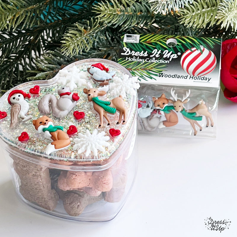 This project starts with a clear giftable container, a few supplies, and of course your Dress It Up buttons. Make one of a kind gift boxes that can be customized for any season, occasion, or individual.