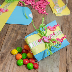 Inside, you’ll find everything you need to create fabulously fun favors: tropical-themed decorations, vibrant ribbon, and 6 easy-to-assemble pillow boxes. Just add your favorite treats, lip balms, or beachy treasures, and let the flamingo fun begin!