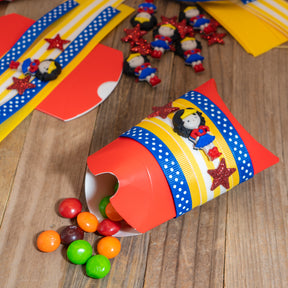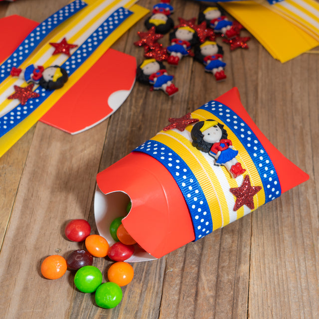 Inside, you’ll find everything you need to create powerful party favors: super-themed decorations, colorful ribbon, and 6 easy-to-assemble pillow boxes. Just add your favorite treats, stickers, or mighty little surprises, and let the celebration soar!