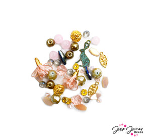 This pink garden themed bead mix features accents of green and gold tones. Mini mixes feature small beads averaging 4 mm in size. This mix features faceted glass, tassels, custom metal components, mini charms, and more.