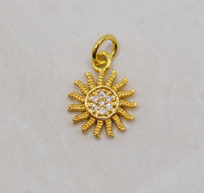 Add a radiant sparkle to your jewelry creations with this Brass Sun Charm adorned with cubic zirconia accents. Plated with real 18K gold for long-lasting shine and free from lead and cadmium, each 13x11x1.8mm charm captures the warmth and brilliance of the sun. Equipped with a jump ring, it’s easy to attach to necklaces, bracelets, earrings, or other creative designs. Perfect for adding a bright, cheerful accent, this sun charm combines elegance, sparkle, and lasting quality in every detail.