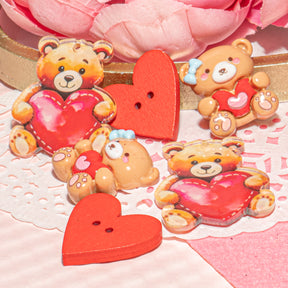 This Valentine-inspired craft pack features large red 2-hole wood heart buttons paired with adorable resin teddy bears holding hearts and matching acrylic teddy bear heart charms. Perfect for scrapbooking, sewing, gift décor, and DIY projects, it adds a cozy, heartfelt touch to every handmade creation.