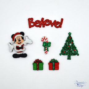 Bring Disney magic to your holiday projects with these Christmas With Mickey buttons! Ideal for scrapbook embellishments, holiday cards, and seasonal decorations, these craft buttons capture Mickey’s holiday cheer and add a joyful touch to any design. Perfect for creating memorable holiday crafts, these embellishments make every project feel merry and bright. Each pack contains a festive Mickey, a Christmas tree, a glittery red "Believe!", candy cane and glittery gifts to create a full festive scene.