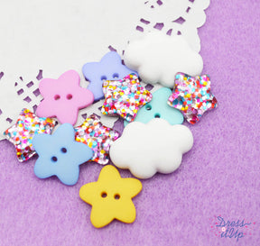 Bright shining stars and soft puffy clouds are the perfect touch to your crafting projects.! Featuring pastel star 2-hole buttons, glitter resin star, and white cloud embellishments. Add to baby quilts, wall hangings, hair bows, socks, special occasion cards and picture frames.