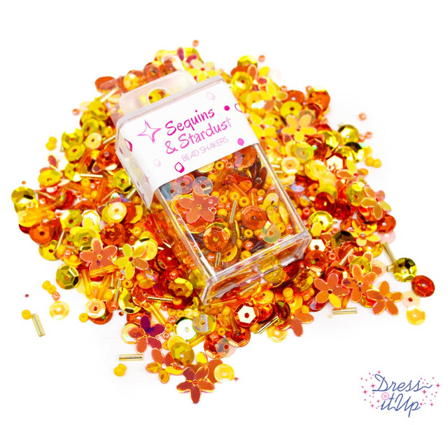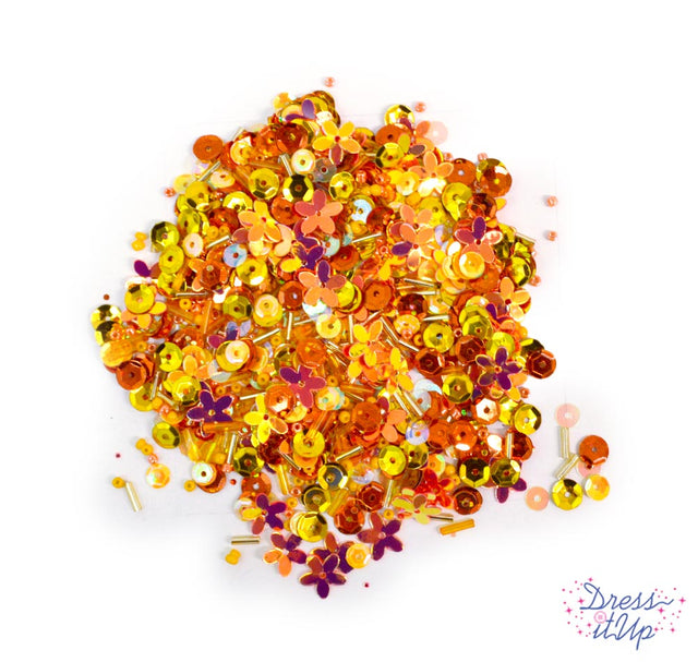 Take a bite of bright oranges and yellows with this vibrant blend of sequins and seed beads. Add to embroidery, felt, papercrafts, and room decor. Each mix includes round sequins, flower sequins, seed beads, bugle beads, and more.