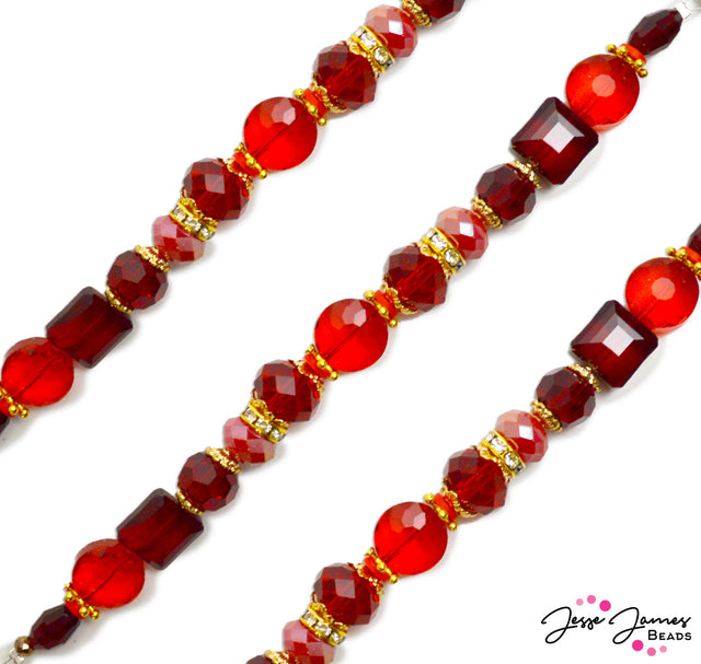 Add warmth and heat to your next project with these stand out red beads. This seven inch bead strand features faceted glass, custom acrylic, custom metal, and more.